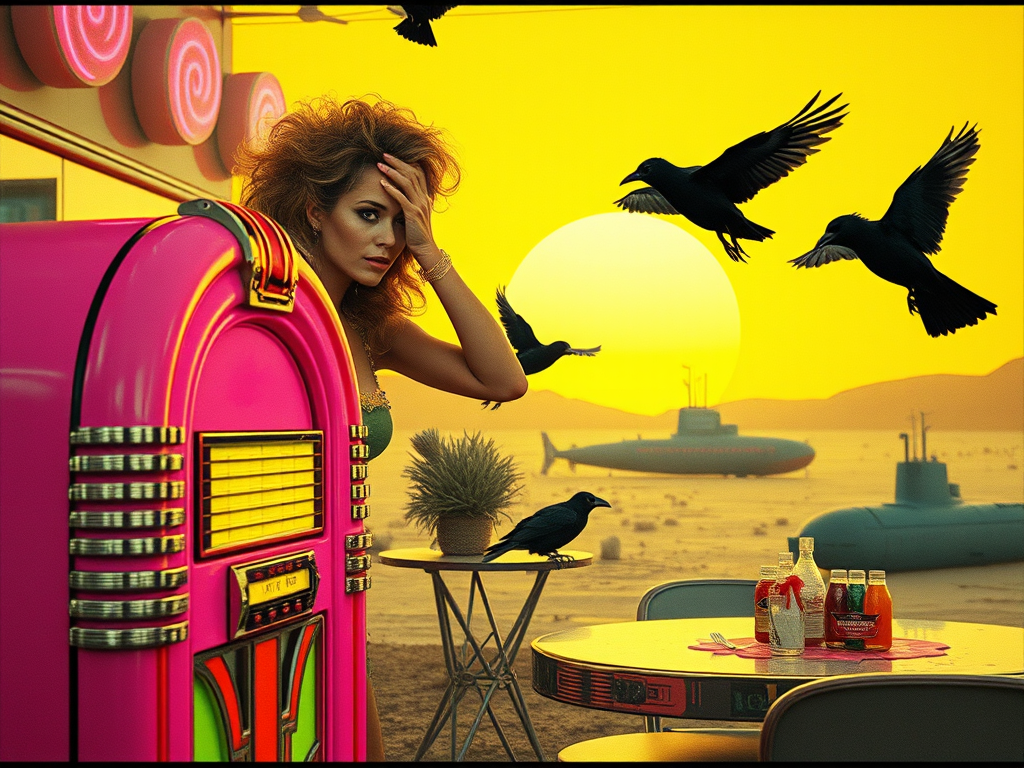 Pink jukebox spins an array of psychedelic tunes in a diner on the wrong side of the desert where the crows dance and bow and she wipes away the sweat from her frosted brow. She thinks it’s cold outside. Cold in the desert. What does she know? It can get cold in the desert. There’s wild wind and snow on those blankets of dirt. And then I don’t like to hear what she says. Toilet breath. Busted lip. Motorcycle up her crotch. Says she’s going to shoot the place up. For what? The demise of manners. She eats fierce cinnamon flavored chewy candies. Shouts something in German. I think she’s a Mad Max type. All hyped up on jolly rogers and gasoline fumes. She pulls out her cell phone and starts taking pictures of the diner. Says she wants to have something to remember it by before she burns it down. Shoot it up? Burn it down? Which is it going to be? Why not just come inside for a nice piece of pie.