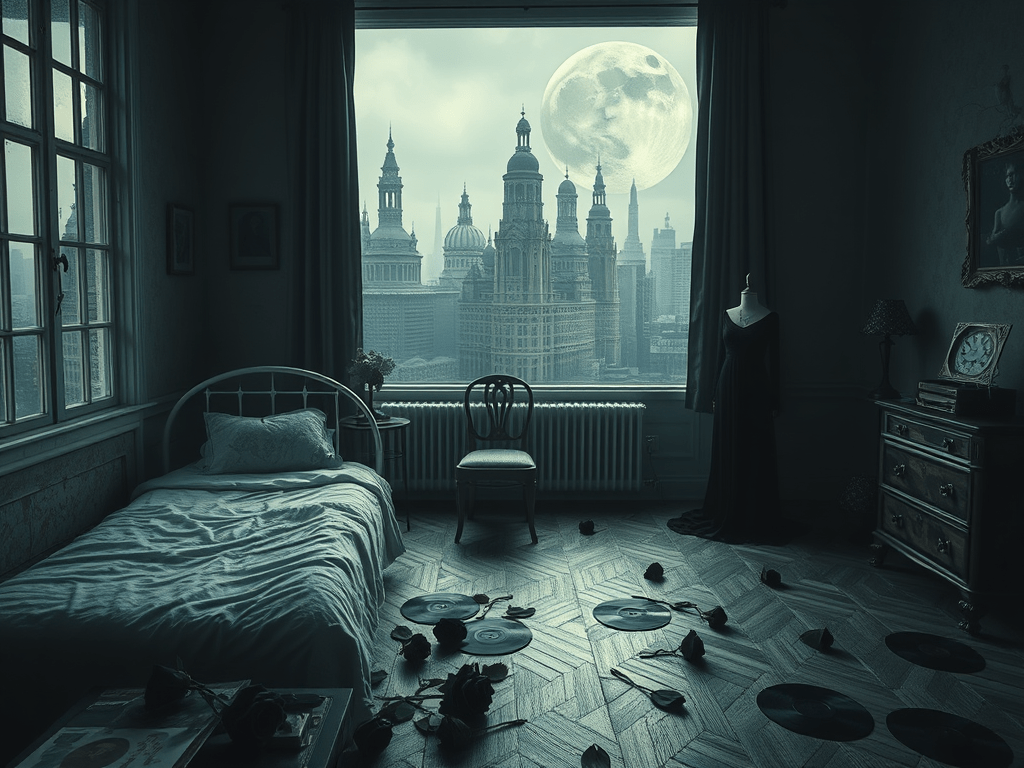 Shadow records play in the dusk-lined room