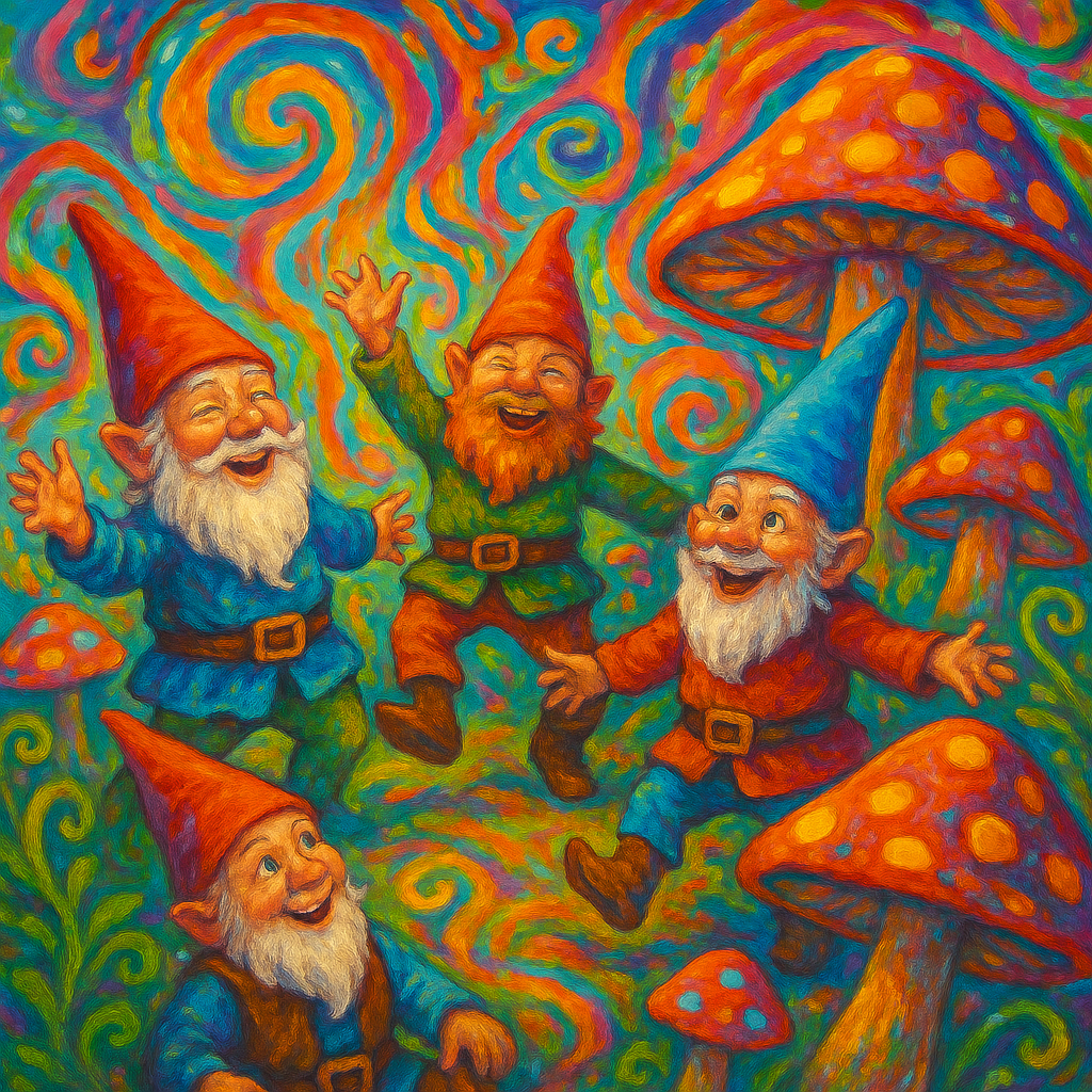 Acid gnomes gather beneath the limbs of swirling trees. Shadow people are on an odyssey of the mind. They walk through walls waving signs of revolution, sticks aloft, shouts enhanced by bizarro anti-totalitarian rage. Assassins of lust vibrato drop down from the sky like hidden monkeys, stalk the monarchy in the halls of the infinite palace and its afterlife echoes.