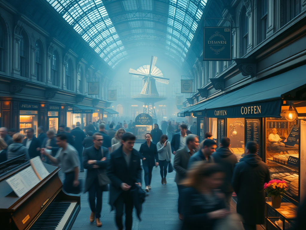 The central corridor of the train station has a blue hue